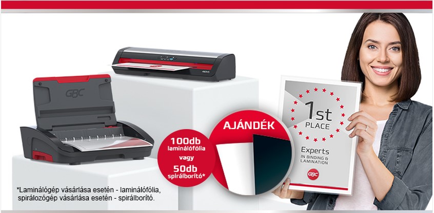 3. Vedd át az ajándékot: a GBC laminálófólia csomagot (100db, 125 mikronos) laminálógép vásárlása esetén, vagy a GBC spirálborító csomagot (25db előlap + 25 hátlap) - spirálozógép vásárlása esetén!